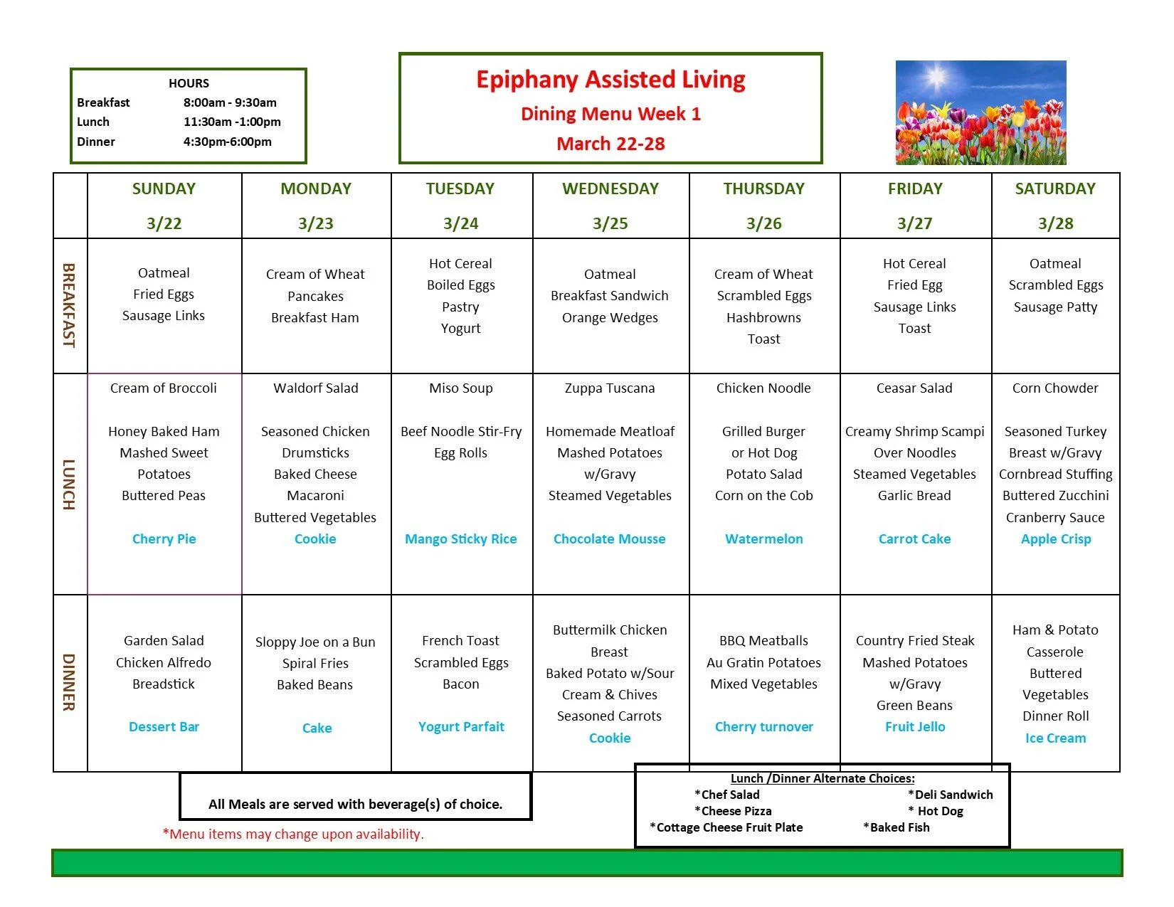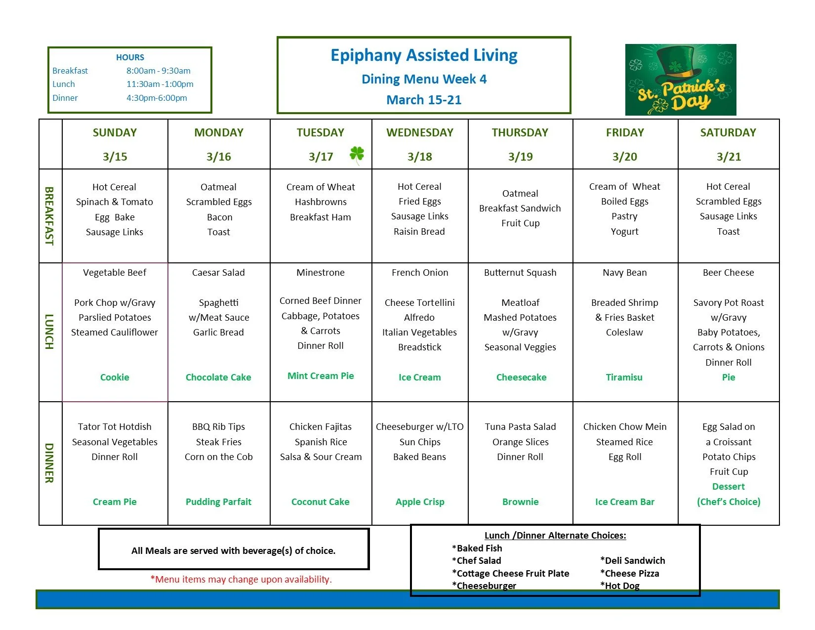 Here at Epiphany Senior Housing, we take pride in offering our residents home-cooked, well balanced meals. See this month’s menus below.